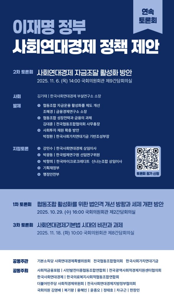 이번 연속토론회는 △협동조합의 법적 지위와 세제 개선 △자금조달 활성화 방안 △사회연대경제기본법 제정 이후의 과제 등 주요 정책 현안을 주제로, 현장의 목소리와 정책 전문가들의 제안을 모아 정부 정책에 반영될 수 있는 대안을 마련하고자 합니다. 국회와 시민사회, 사회연대경제 주체들이 함께 머리를 맞대고 제도적 개선 방향을 논의하는 이번 토론회에 많은 관심과 참여를 바랍니다.